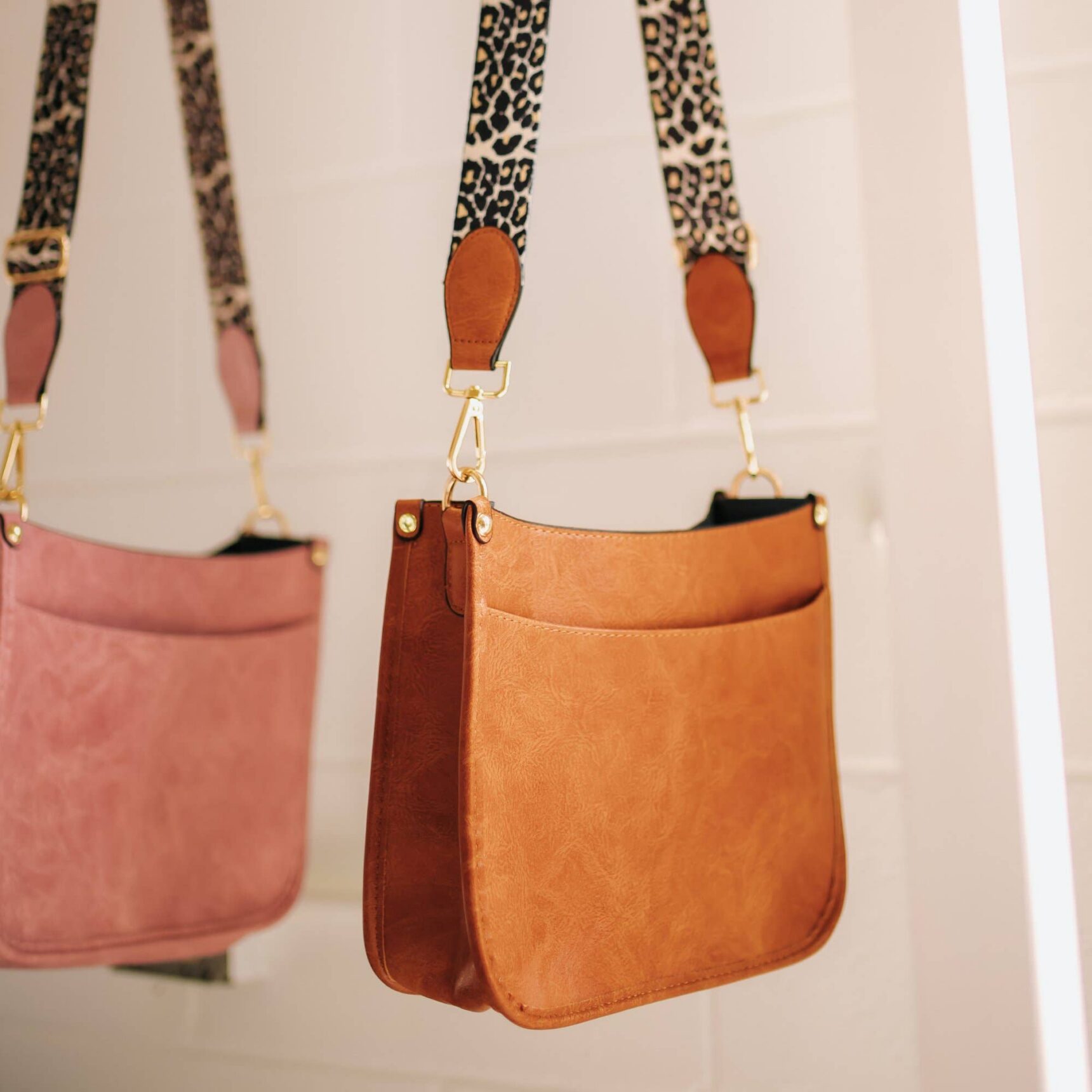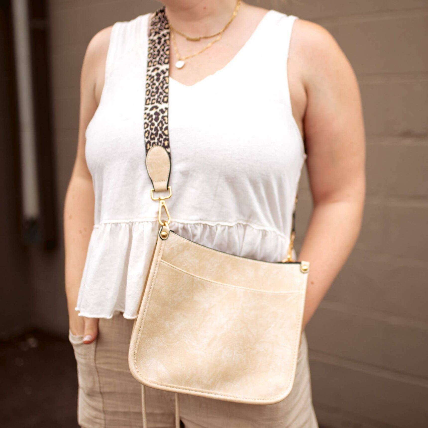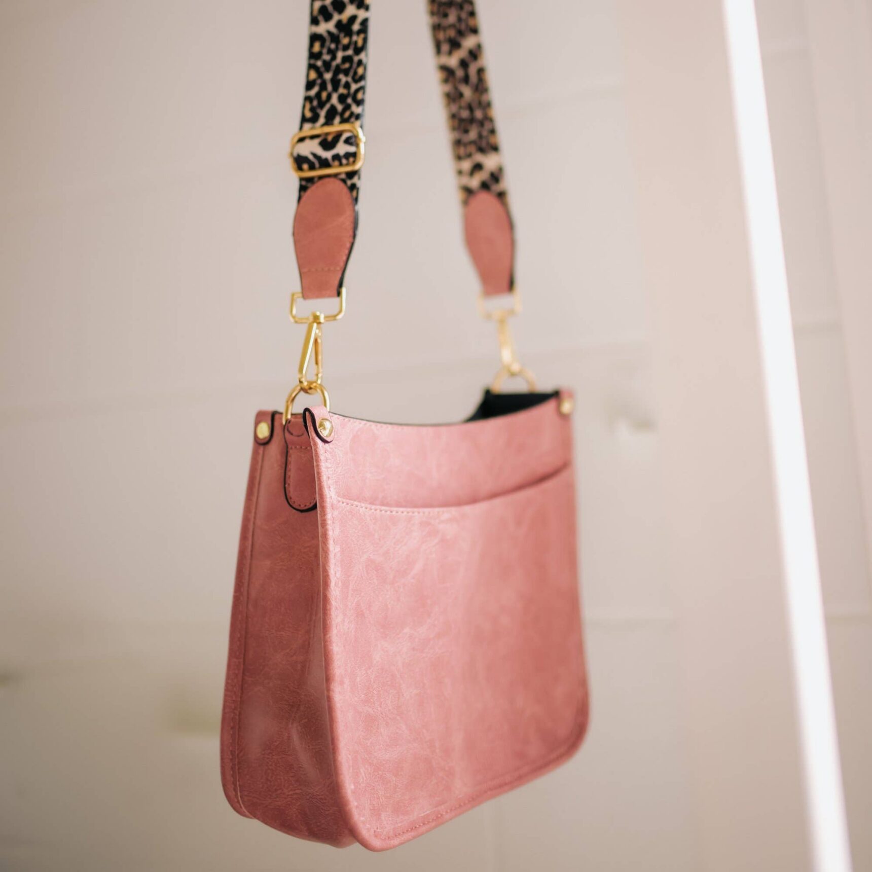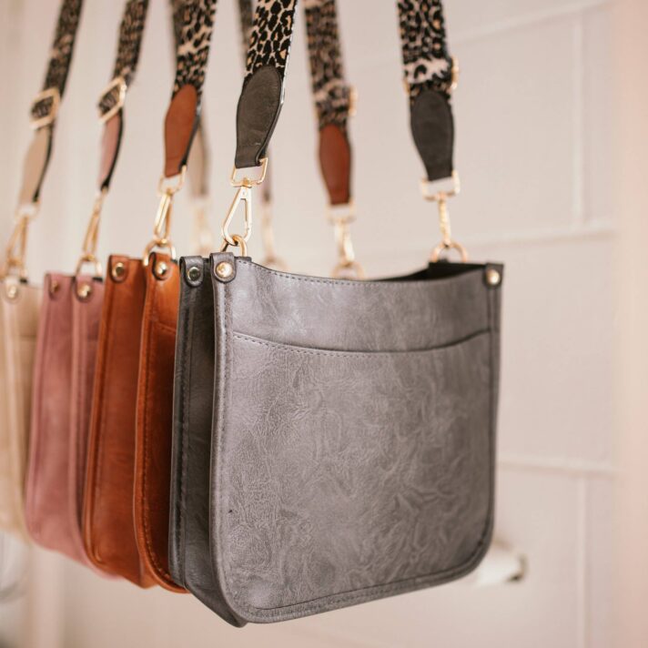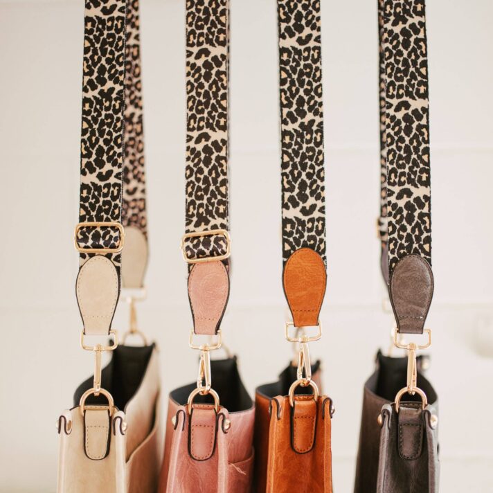 The Caitlyn Faux Leather Crossbody Bag features a textured faux leather finish with a leopard canvas strap and gold-colored hardware! Adjustable shoulder strap up to 46 inches. Gold-colored hardware. Black-colored lining. Bag measures 10″ x 8″ x 3.5″ Main material: PU Leather; Other: cotton liner No Top Closure. Open Bag. Spot clean